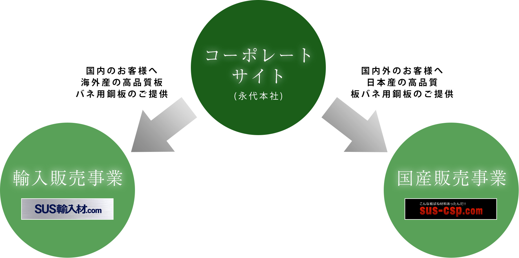 コーポレートサイトを軸とし、「国産板バネ用鋼板の販売」と「高品質板バネの輸入販売」サイトを事業とともに展開しています。